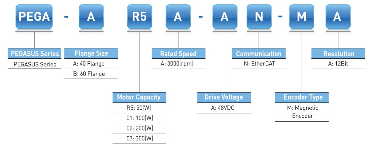 LS Industrial Systems je s serijo PEGA (Pegasus) prinesel na trg koncept integriranega servo sistema, ki v eni napravi združuje servo motor, pogon in enkoder. Na voljo so produkti moči od 50W do 300W (nazivni tok: 1,77A – 6,8A). Prednosti serije Pegasus so predvsem varčevanje s prostorom ter enostavna in cenejša inštalacija.